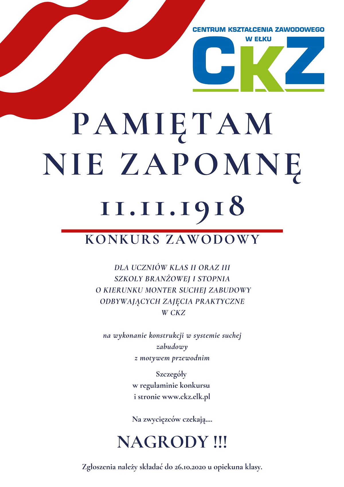 Konkurs Zawodowy "PAMIĘTAM NIE ZAPOMNĘ 11.11.1918 r. - Konkurs Zawodowy dla uczniów klas II oraz III szkoły branżowej I stopnia o kierunku suchej zabudowy odbywających zajęcia praktyczne w CKZ